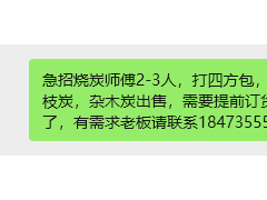 急招烧炭师傅2-3人,打四方包,另外有大量青岗炭,荔枝炭,杂木炭出售,需要提前订货的老板抓紧时间下单了,有需求老板请联系18473555908,微信同号。
