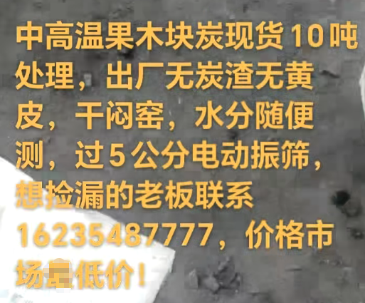 中高温果木块炭现货10吨处理,出厂无炭渣无黄皮,干闷窑,水分随便测,过5公分电动振筛想捡漏的老板联系 16235287777,价格市场低价!